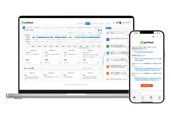 poliseeは、政策関連情報の監視・分析・共有をAIで自動化する次世代の政策インテリジェンスプラットフォームです。分散する会議資料、議事録やパブリックコメント資料を構造化して整理し、論点の経緯を一目で把握可能にします。圧倒的な情報収集スピードと正確な可視化により、リスク管理と市場機会の発見を両立。政策渉外の実務家が設計が、戦略的な意思決定に集中できる環境を創出し、ルール形成時代の競争力を支えます。